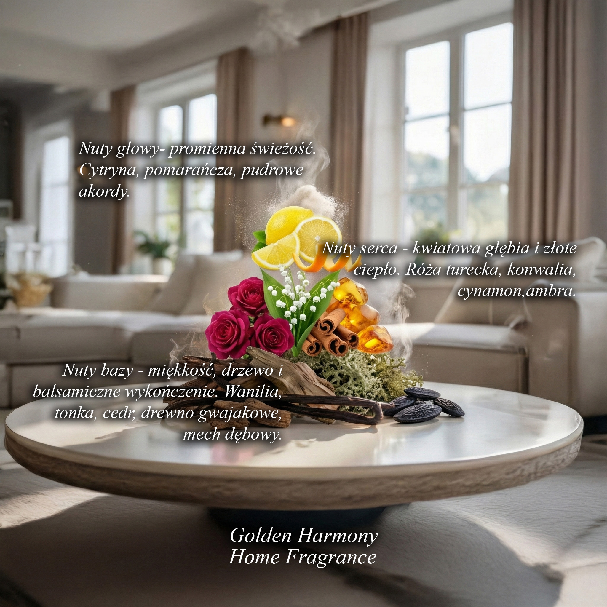 Golden Harmony: cytryna i pomarańcza w otwarciu, róża, konwalia i cynamon w sercu, a w bazie wanilia, tonka, cedr, gwajak i mech dębowy.