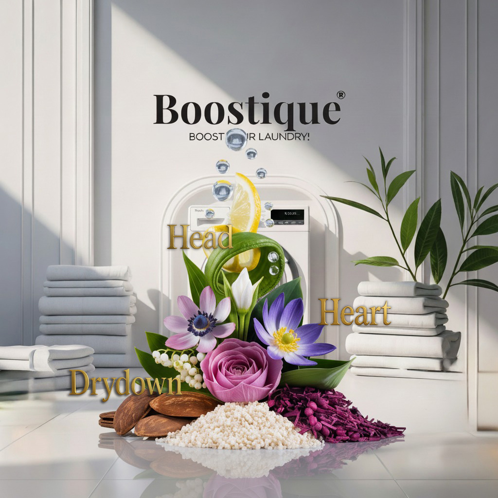 Bazę zapachu stanowi kremowa, aksamitna fasola tonka oraz czyste, otulające białe piżmo, które zapewniają długotrwały, przyjemny aromat na tkaninach, bez nadmiaru intensywności.